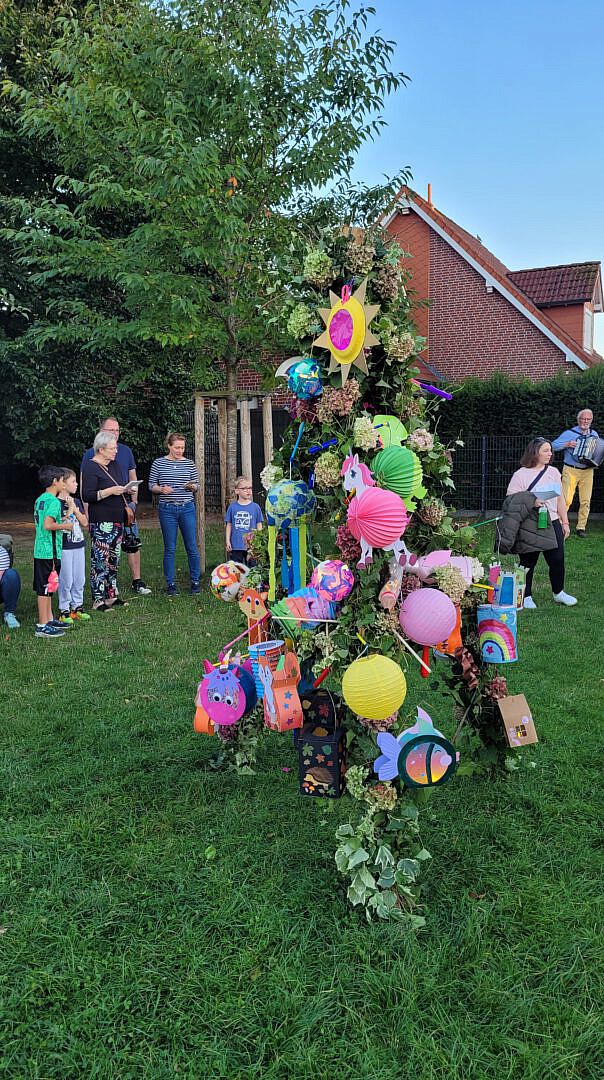Anschließend begann die Lambertusfeier mit dem Lied „Ich geh mit meiner Laterne…“. Unter musikalischer Begleitung von Bernhard Karrengarn mit seinem „Trekkebühl“ steckten die Kinder ihre Laternen in die bunt geschmückte Pyramide. Danach wurden die traditionellen Lambertuslieder gesungen z.B. „Laurentia, liebe Laurentia mein“ oder „Guter Freund, ich frage Dir“ oder „Dumme Liese hole Wasser“ usw.