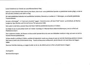 In´n Kristmaond (Dezember) föllt de Küerkring ut. Wi driäpt ues iärst wier in´t nie Jaohr an Gunsdag, 28. Harremaond (Januar) üm Klok sieben bi Sültemeyers.